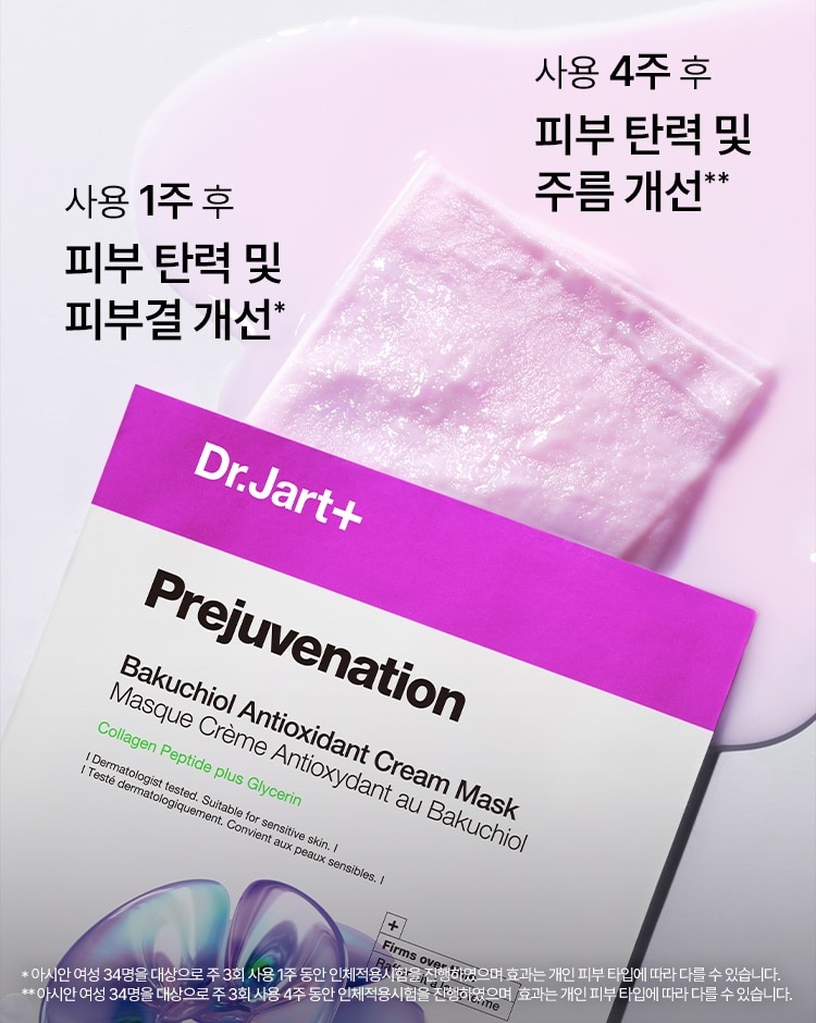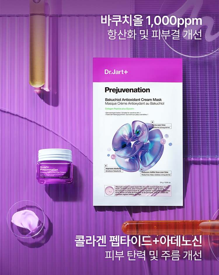 바쿠치올(1,000ppm)과 콜라겐 펩타이드, 아데노신 3가지 복합 성분으로 보습·광채·탄력을 끌어올리는 크림 코팅 마스크프리쥬비네이션 바쿠치올 안티-옥시던트 크림 마스크