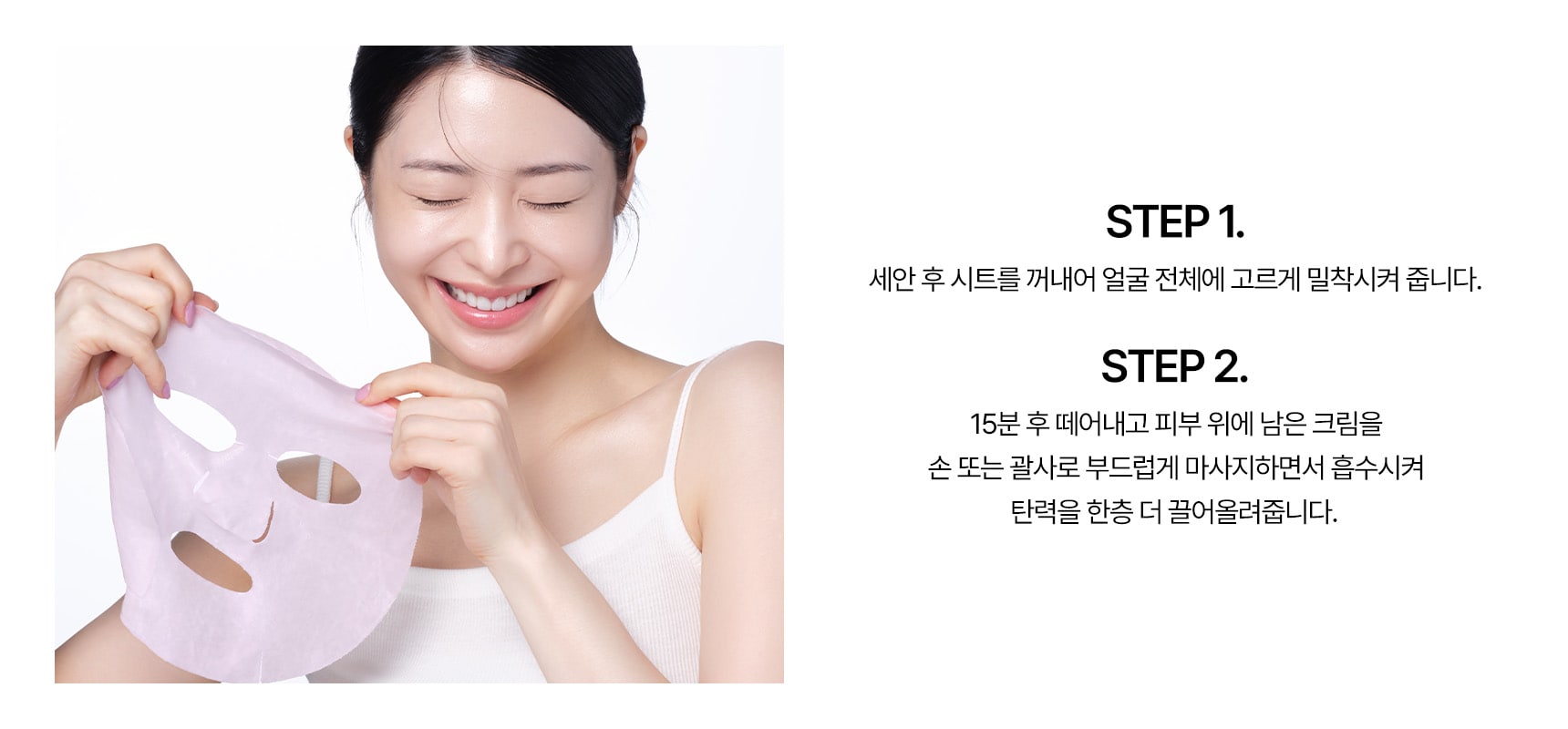 부드러운 극세사 시트와 시트에 코팅된 에센스-투-크림 제형이 피부 자극 없이 가볍게 밀착! 끈적임 없는 풍부한 피부 보습으로 사용 후 피부 톤이 한층 맑아집니다.